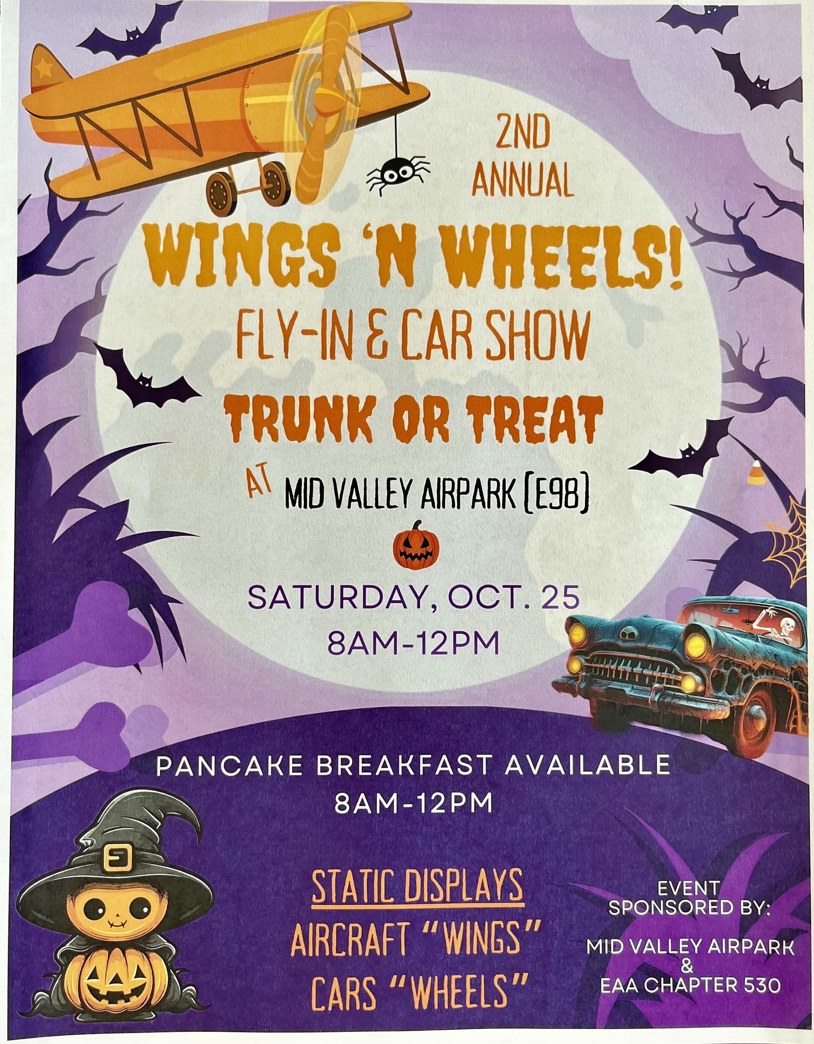 Wings N Wheels Fly In and Car Show at Mid Valley Air Park (E98), Saturday Oct 25; 8am - noon. Pancake breakfast. Flyer below.